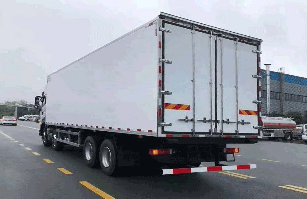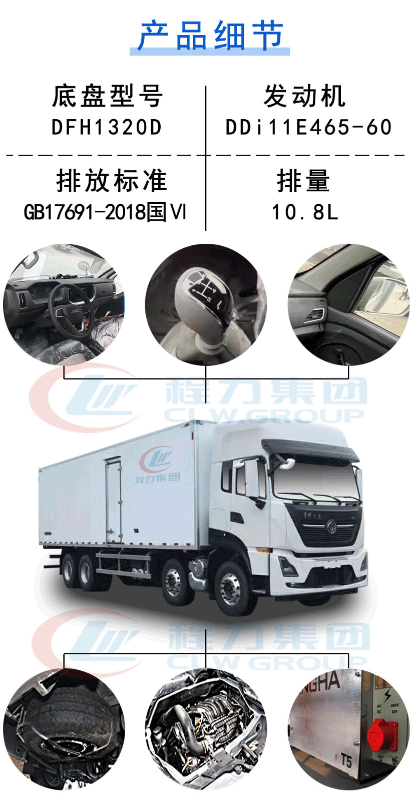 其他 | 隨底盤選裝僅高度不同的駕駛室,高頂駕駛室頂部氣喇叭為選裝件,駕駛室前角擾流板為選裝件,選裝單油箱或雙油箱;貨廂選裝單開門,雙開門和不開門型式;選裝其它廠家功率相當的制冷機組,選裝前置式,內置式,底置式制冷機組;選裝升降尾板,尾板收起狀態時的水平長度為295mm;廂體頂部封閉,不可開啟;側防護:材料Q235,螺栓連接;后下防護:材質Q235.螺栓連接,斷面尺寸120×60mm,離地高度460mm;安裝具有衛星定位功能的行駛記錄儀;裝有ABS,ABS型號/生產廠家:ABS 8/東科克諾爾商用車制動系統(十堰)有限公司;發動機DDi11E465-60對應油耗申報值37.1L/100km. |
