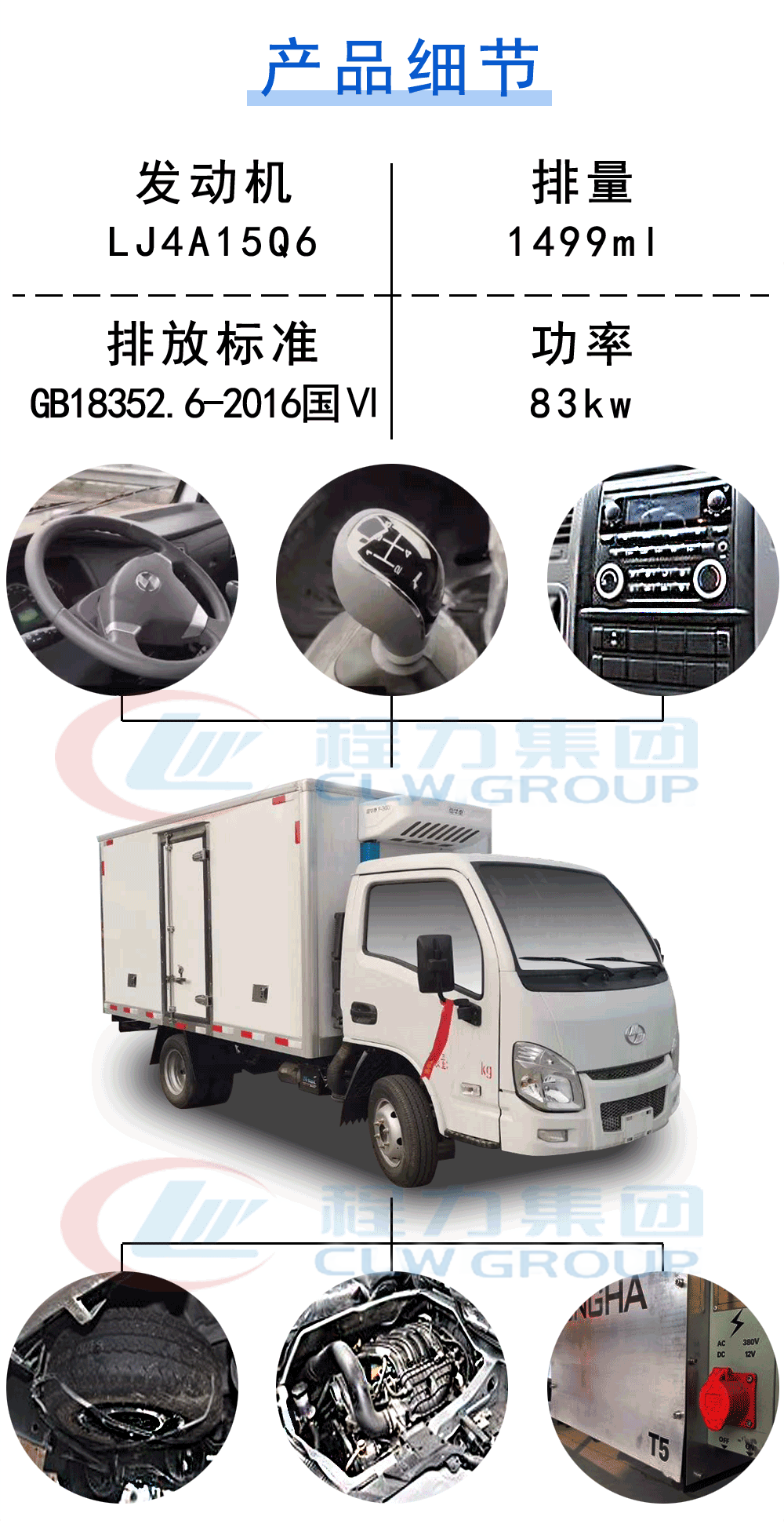 其他 | 1.ABS控制器型號/生產廠家:YF8/武漢元豐汽車電控系統有限公司;2.LJ4A15Q6凈功率為79kw,對應油耗值為9.6L/100km;3.車廂頂部封閉不可開啟;4.車廂可選裝不開門或側開門,可選裝左或右側開門,不同外觀側門和后門;5.可選裝導流罩;6.選裝其他廠家功率相當的制冷機組,KV300英格索蘭(中國)投資有限公司,K125勁達技術(河源)有限公司,MK358勁達技術(河源)有限公司;7.冷藏車類別:F類;8.隨底盤選裝駕駛室前圍面板,前圍格柵,后視鏡,前部燈具,前保險杠外觀,擴展輪輞外觀,擴展輪眉,隨底盤選裝排半駕駛室;9.駕駛室左側車門選裝裝飾標貼. |
