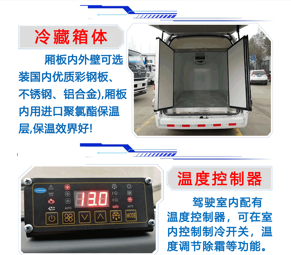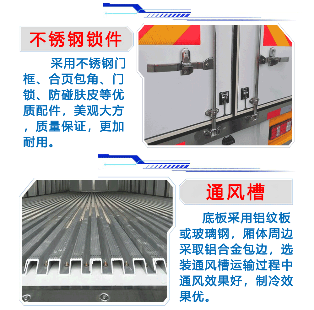 上裝配置:箱體為內(nèi)外玻璃鋼板,中間保溫材料為8cm聚氨酯保溫板,鋁花紋底板,箱體鋁合金型材包邊,包角,配雙開后門,單開側(cè)門,不銹鋼門框、鎖件、鉸鏈,其余